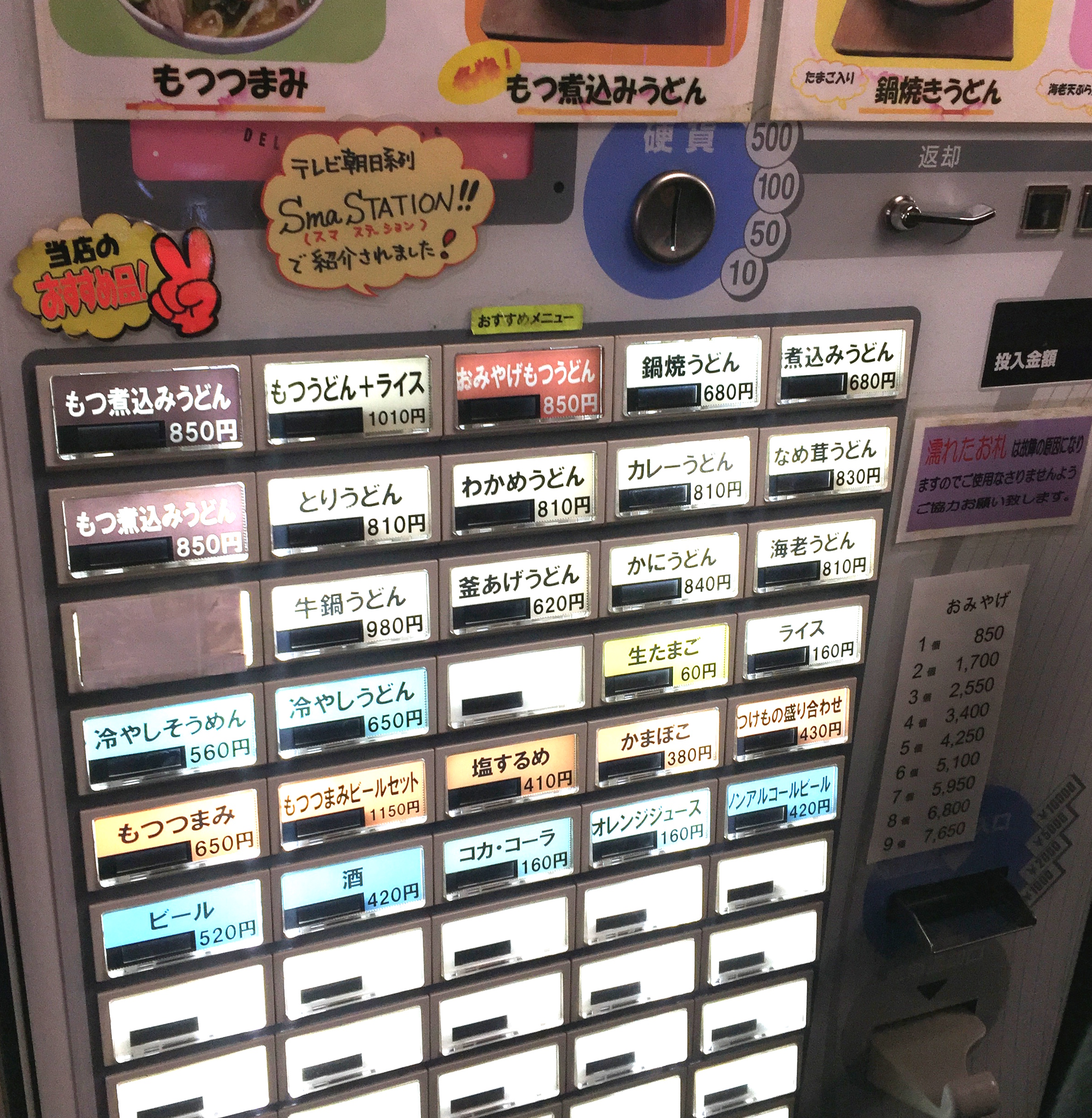 まずは、食券を購入しよう!!名物である「もつ煮込みうどん」を購入。 他にも、各うどんがありますが.. 9割方「もつ煮込みうどん」です。 職人さんは、来店されるお客さんを先読みし「もつ煮込みうどん」を作っています。