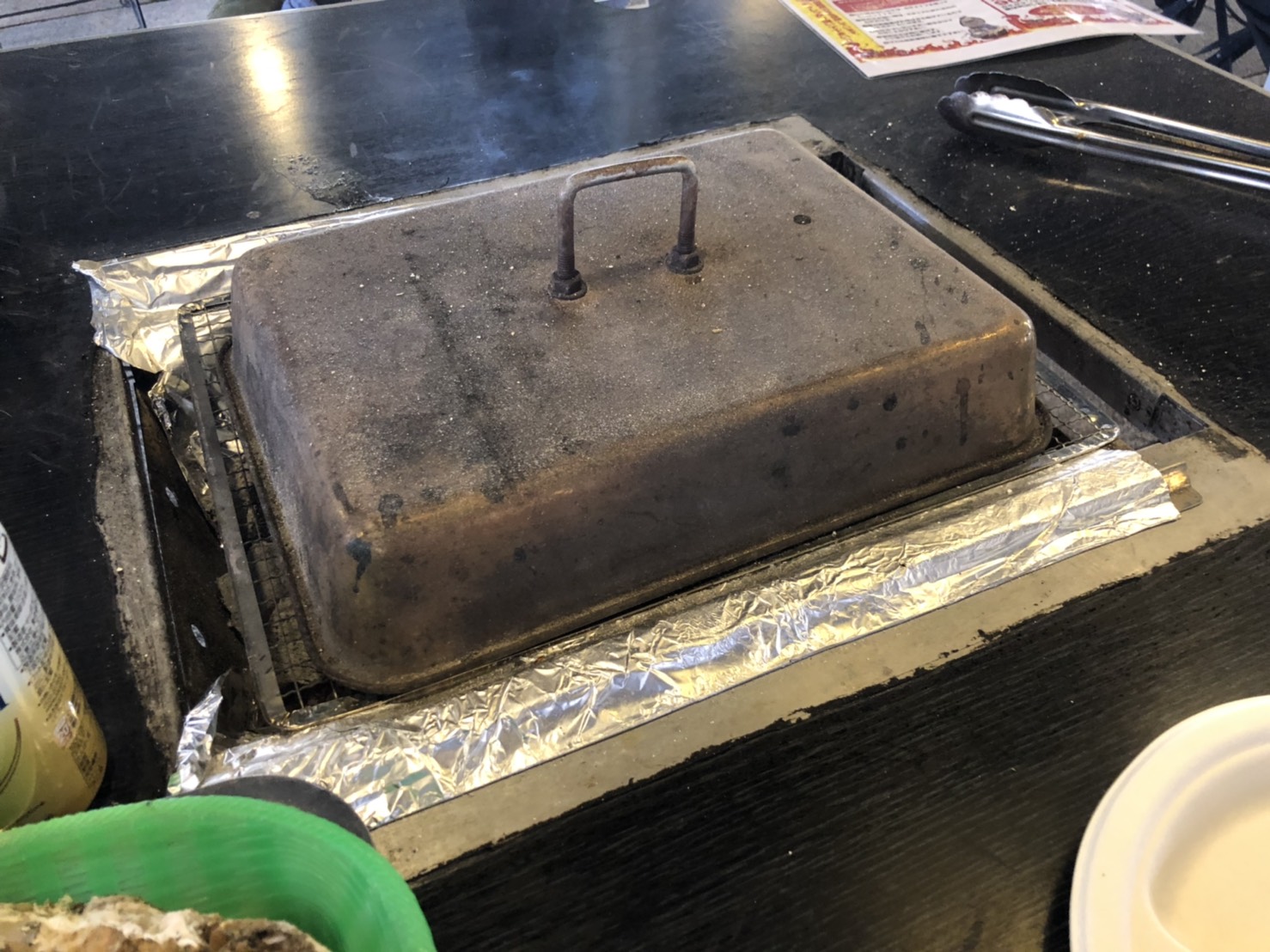 案内されたテーブルで、トングや軍手、紙皿の置いてある場所、ゴミの片付け方、
